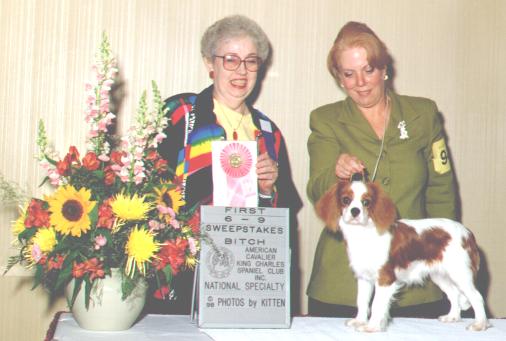 NATIONAL SPECIALTY First in  her class, 6-9 Sweepstakes. April 1998 Under respected Breeder/Judge Mrs. Hazel Arnold  (Handled by Judy Glasgow)